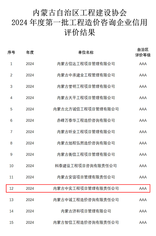 2024-07-3015182 次近期,我公司参加内蒙古自治区工程建设协会组织的“2024年度第一批工程造价咨询企业信用”申报,获得“信用AAA级证书”。我公司成立多年以来,遵循中国工程造价管理协会对造价咨询企…